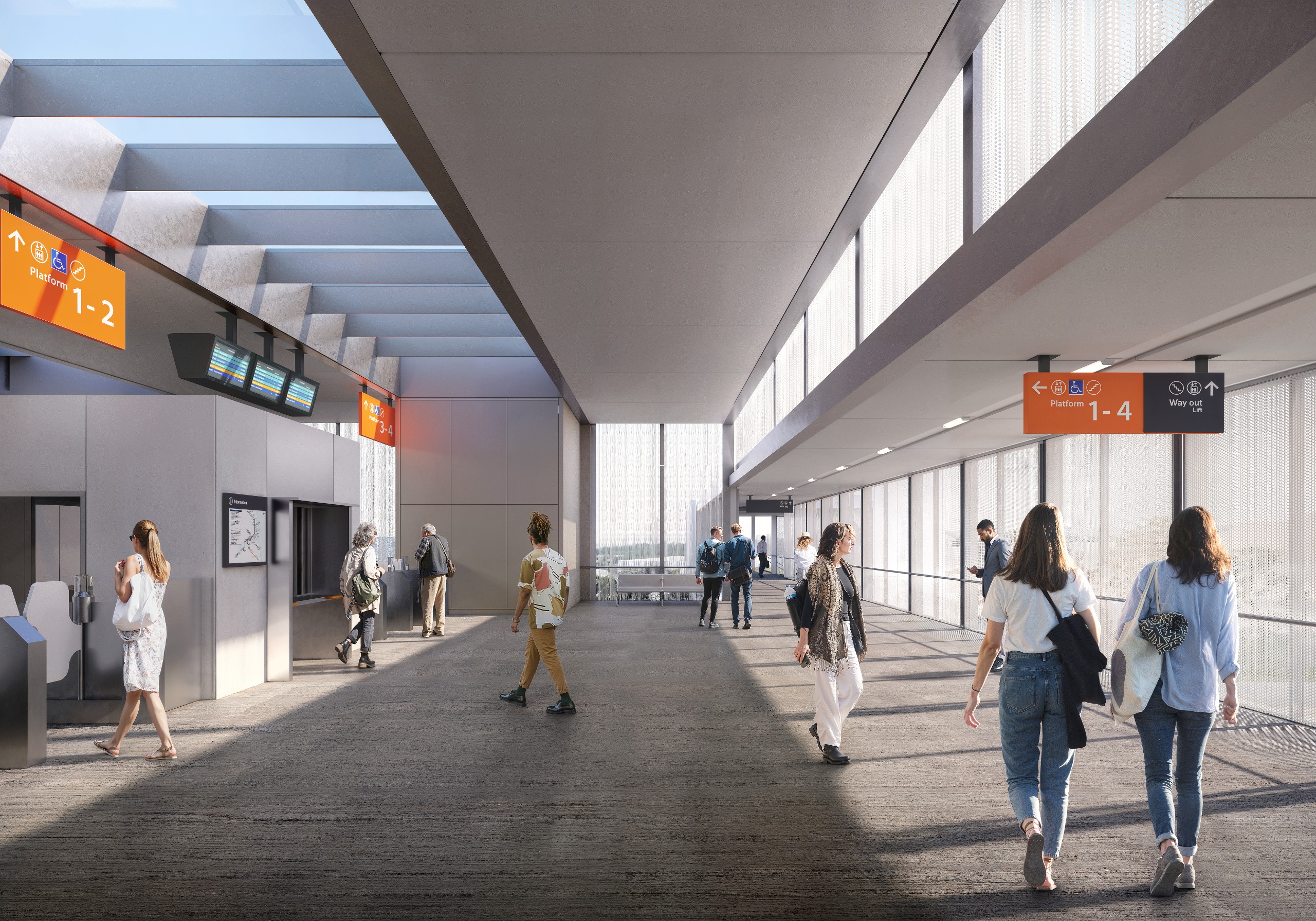 Artist impression of inside the Beenleigh station overpass and entrance to platforms.