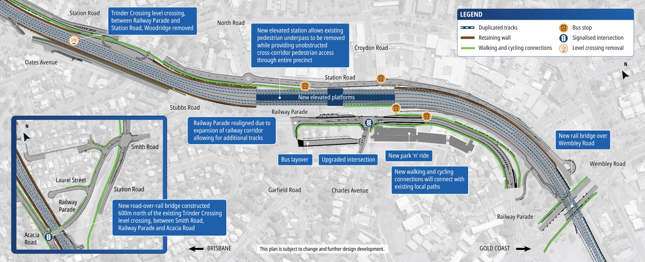 We are removing the Trinder Crossing level crossing between Railway Parade and Station Road, Woodridge. A new road-over-rail bridge will be constructed approximately 600m north (closer to the new Trinder Park station) at Acacia Road and a realigned Railway Parade, with new local road connections through to Smith Road.