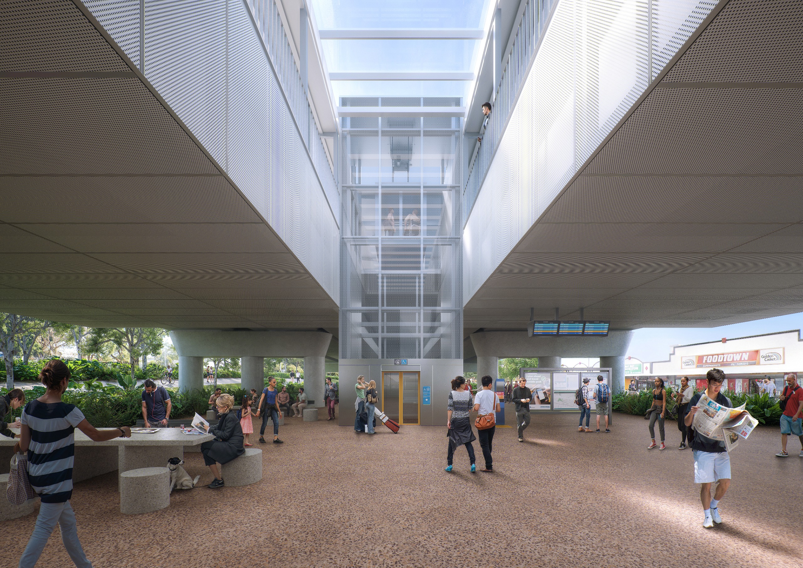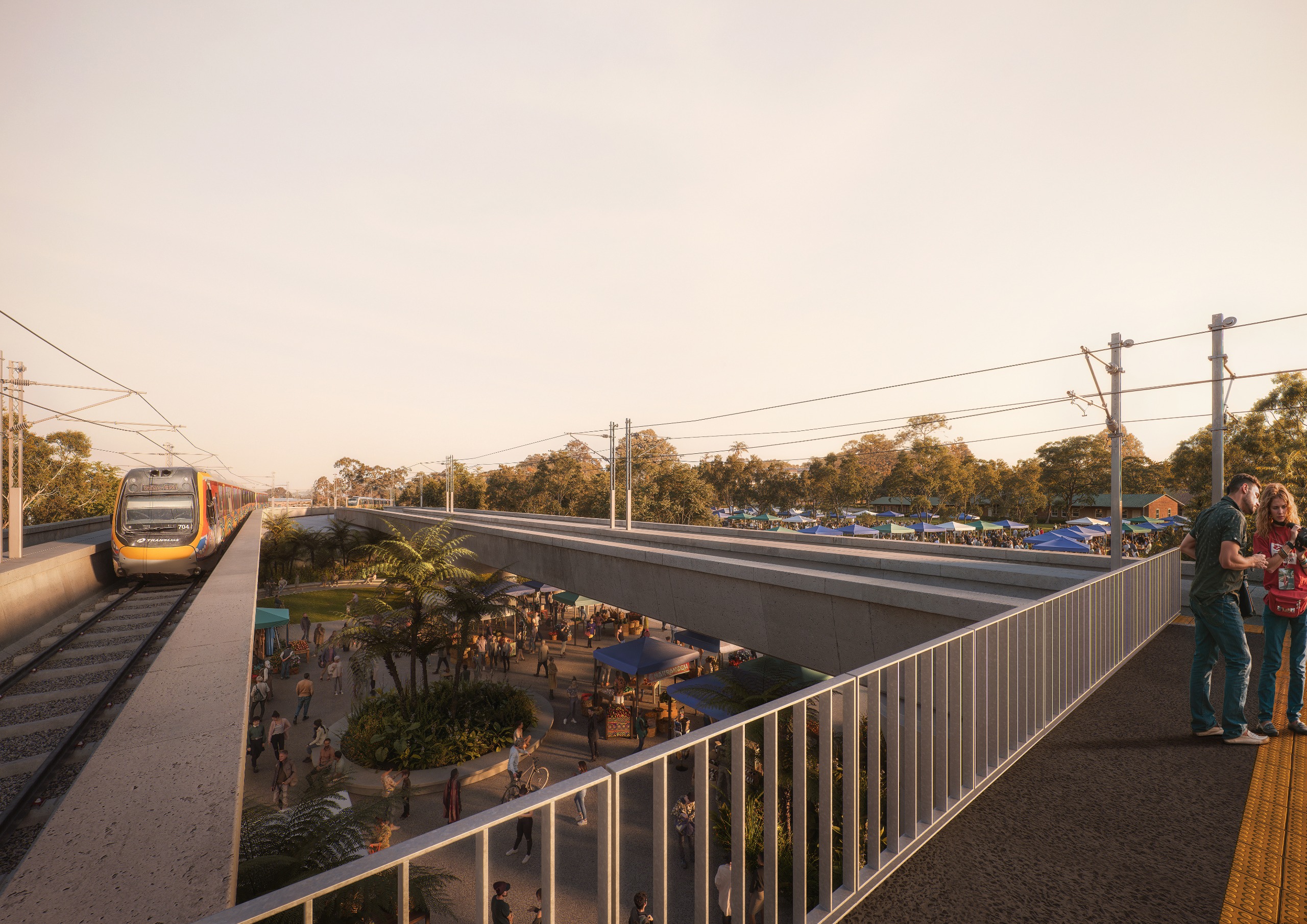 The updated design elevates the station, providing street-level public access across the rail corridor, significantly improving safety and local connectivity. New lifts and stairs will be provided to the station, as well as a consolidated park ‘n’ ride on Railway Parade.